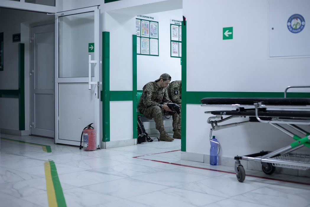 Dies ist kein normales Krankenhaus, sondern ein Krankenhaus im Krieg: Die Fenster sind von innen mit Sandsäcken oder Sperrholzplatten befestigt. Ab neun Uhr abends gilt in der gesamten Stadt strikte Verdunkelungspflicht, was in einer solchen Einrichtung nur teilweise möglich ist. Bisher hatten sie noch keine Probleme mit Raketen- oder Artilleriebeschuss, sie liegen außerhalb der Reichweite der meisten Waffensysteme. Marschflugkörper und Raketen wie die russische „Kalibr“ oder „S-300“ könnten ihnen hier zwar gefährlich werden, sind in der Regel aber für Großstädte wie Kiew oder Odessa bestimmt, die in den letzten Wochen wieder heftigen Attacken ausgesetzt waren. „Wir verlassen uns hier auf unsere Luftabwehr“, sagt Michail. Auch wenn seine Einheit bei der Evakuierung von Mariupol im Frühjahr 2022 Opfer zu beklagen hatte, fühlt er sich hier relativ sicher.