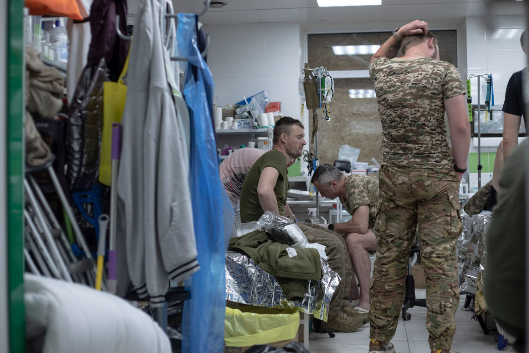Hier werden die von den Sanitätern angelegten Verbände aufgeschnitten und die Wunden weiterversorgt. Alle in diesem Raum wurden durch Schrapnelle an den Armen und Beinen verletzt. Nebenbei werden ihre Uniformjacken und Hosen auf persönliche Gegenstände abgesucht und in Müllbeutel gesteckt. Später wird eine Krankenschwester erzählen, dass sie immer darauf achten müssten, dass keine Munition oder sogar Granaten in den Klamotten sind. In der Hektik an der Front könnten das die Sanitäter manchmal nicht gewährleisten. Einmal kullerte ihnen deswegen schon eine Handgranate aus einem Rettungswagen entgegen, die zum Glück nicht explodierte.